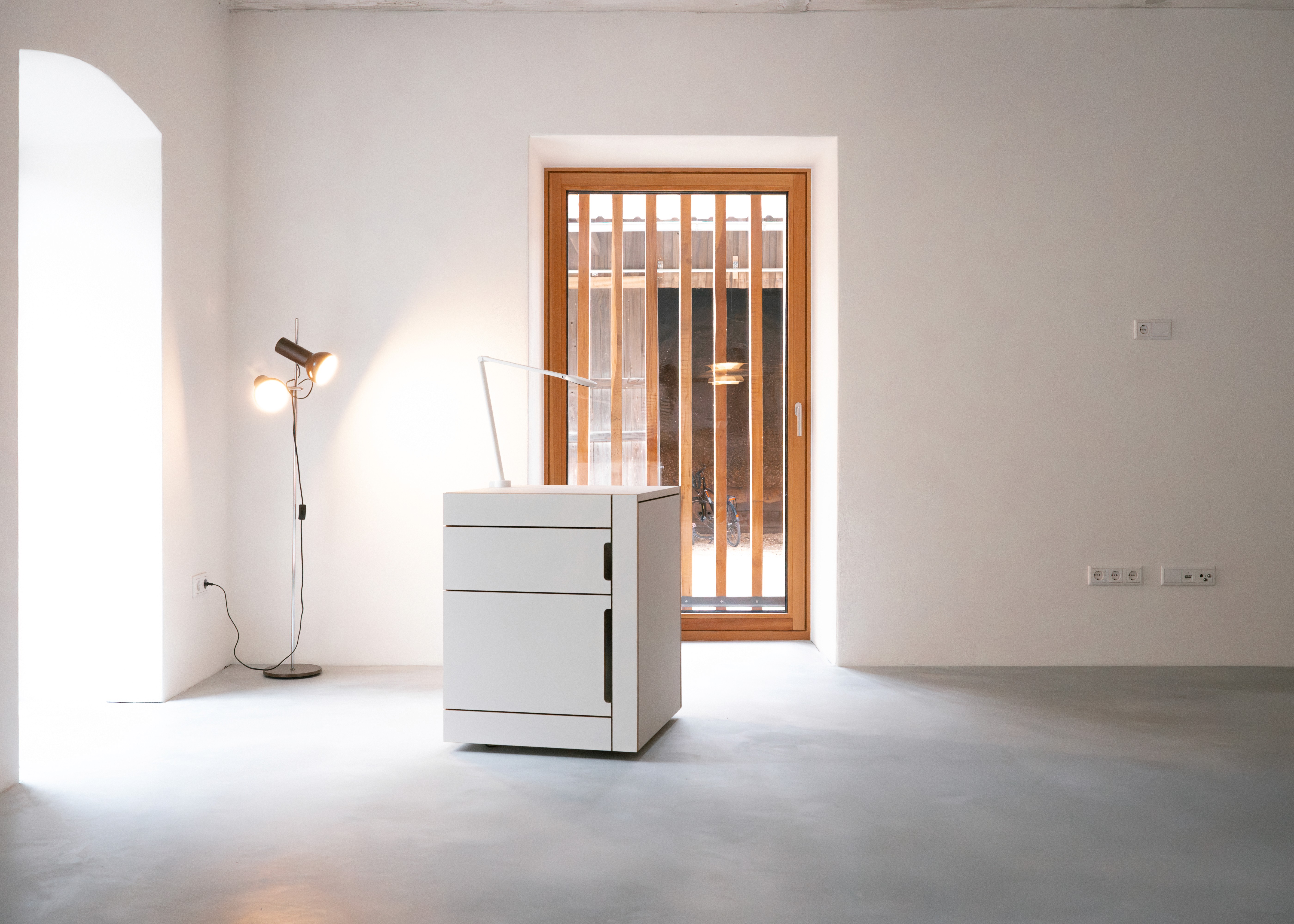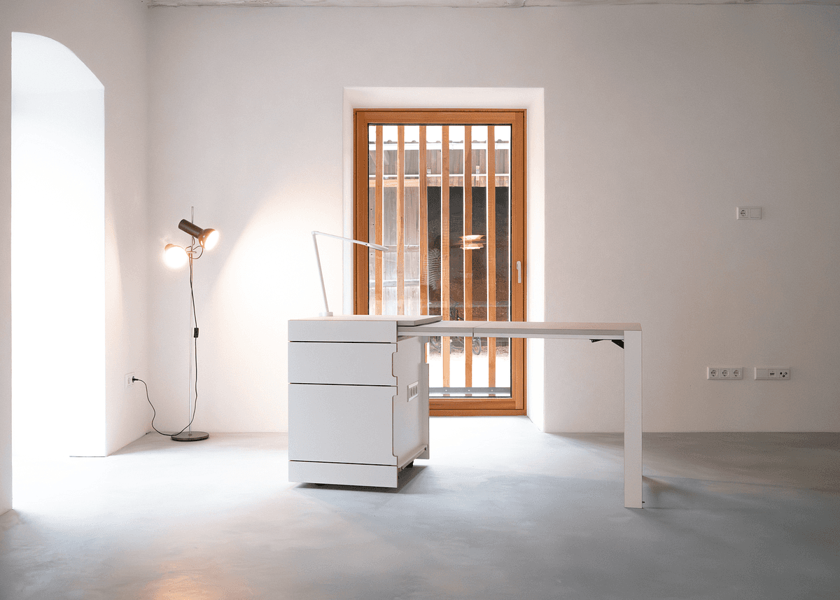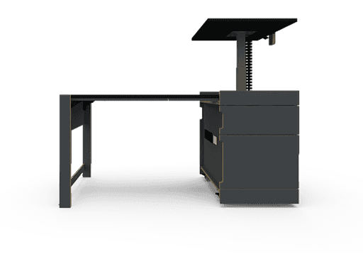 Schreibtisch, Rollcontainer & Steharbeitsplatz vereint in einem einzigen Möbelstück.