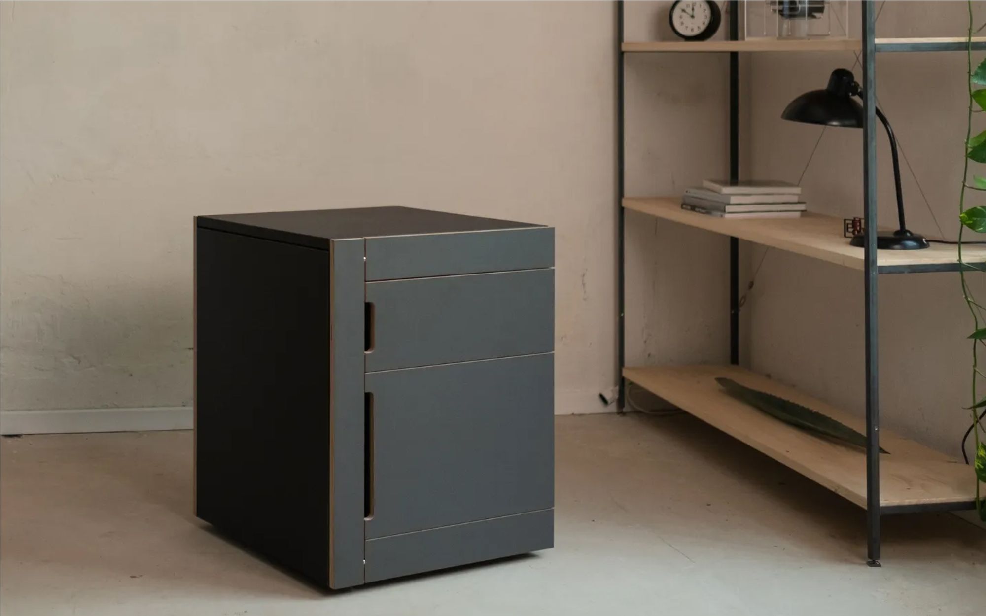 Wozu ein ganzes Arbeitszimmer, wenn es auch ein Einzelmöbel tut? Unser All-in-One Schreibtisch vereint Rollcontainer, Schreibtisch und Steharbeitsplatz in einem einzigartig vielseitigen Einzelmöbel.